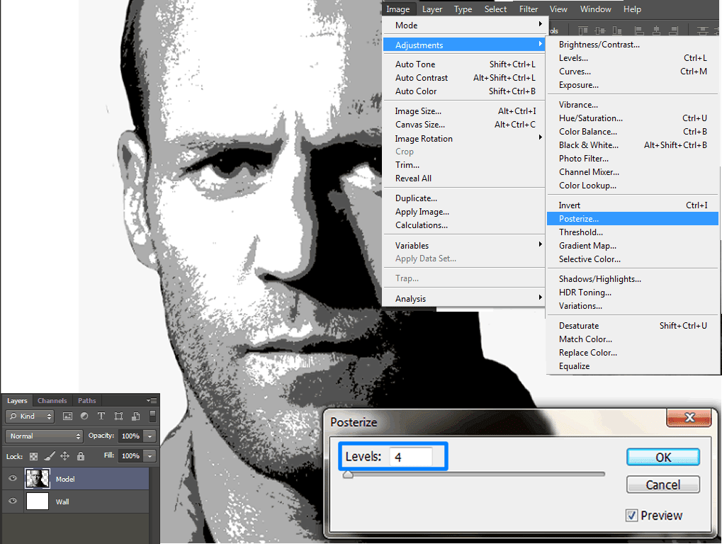 Again go to “Image→Adjustments→Posterize” and set the value as “4“.